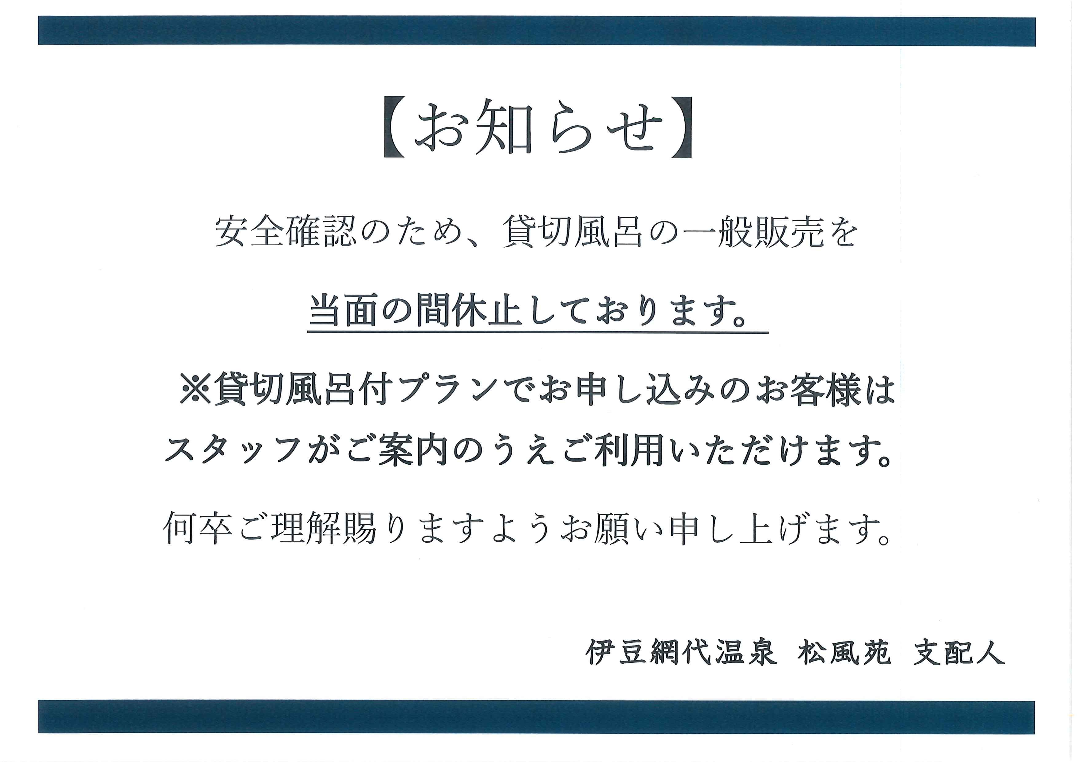 安全確認のため、貸切風呂の一般販売を当面の間休止しております。※貸切風呂付プランでお申し込みのお客...